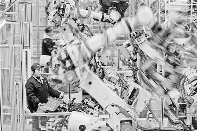 图为长兴地通汽车部件有限公司工人在数字车间内操控工业机器人,赶制新能源汽车配件。