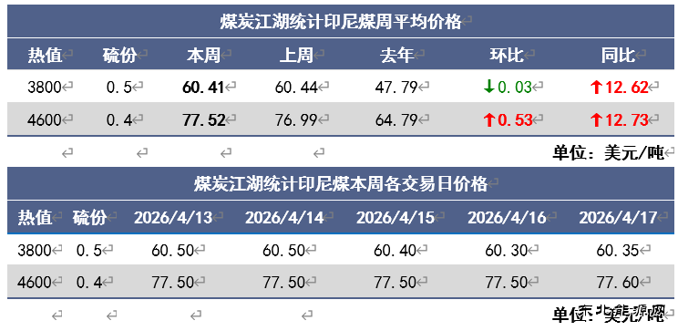 截至上周五,印尼煤3800卡报价为FOB60.4美元/吨,和上周基本持平;4600卡报价为FOB77.6美元/吨,比上周略上涨了0.1美元/吨。印尼大多数煤矿生产额度获批,但短期供应偏紧局面无明显改观,矿方挺价情绪偏强。国内电厂拿货数量虽较此前有所增加,但受高昂的到岸价格限制,价格倒挂多数流标。