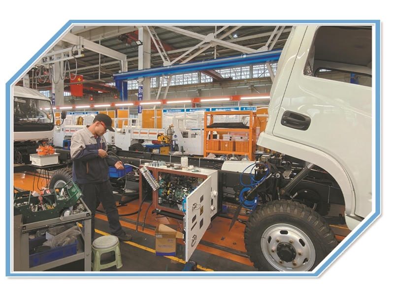 下图在中国煤炭科工集团太原研究院有限公司,工人对煤矿用无轨胶轮车进行组装。