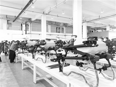 哈尔滨联合飞机科技有限公司内,工作人员正在组装Q100农林植保无人机。