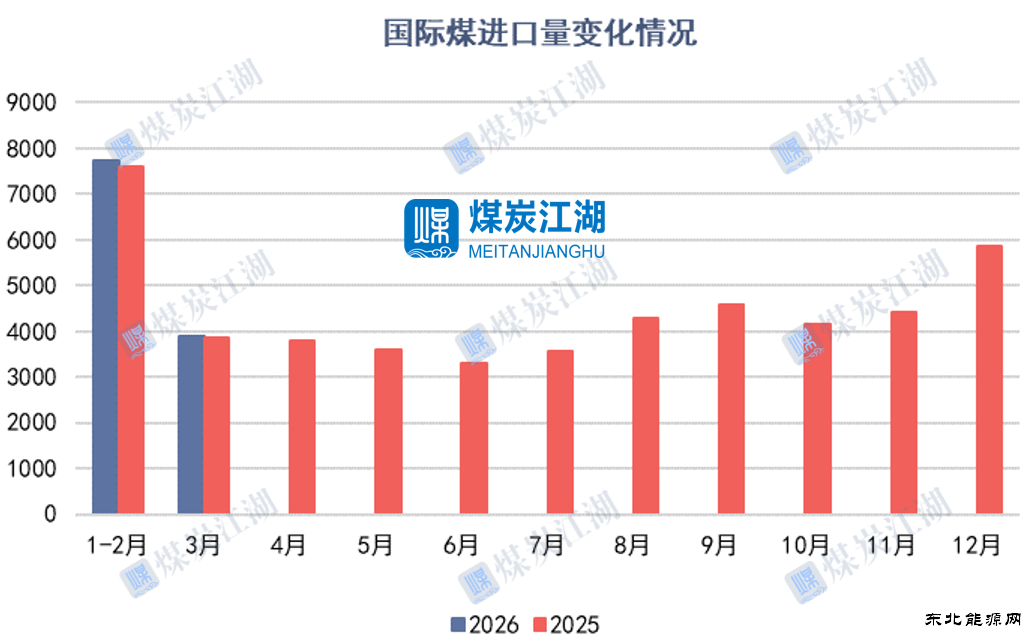 3月份煤炭进口量同环比均增:据海关公布的数据显示,2026年3月份,我国进口煤炭3905.9万吨,较去年同期增加32.7万吨,同比增长0.8%;较2月份增加了811.6万吨,环比增长26.2%。2 月份受春节假期等因素影响,煤炭进口量相对较低。3 月份企业复工复产全面推进,工业生产对煤炭需求显著回升,电厂、化工等企业积极补库,带动煤炭进口量增加。