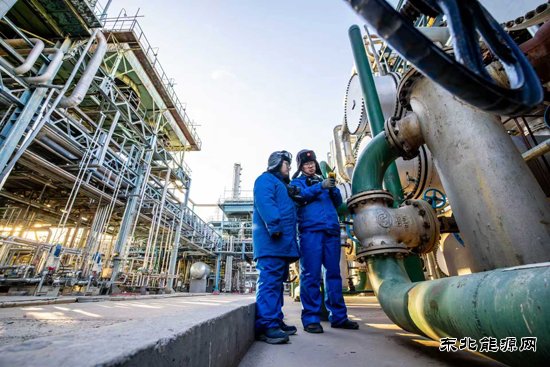 图为12月8日,大庆石化乙烯一部裂解装置区员工监测关键点位温度,细致检查压缩机换热器运行状态,持续优化调控蒸汽管网压力。