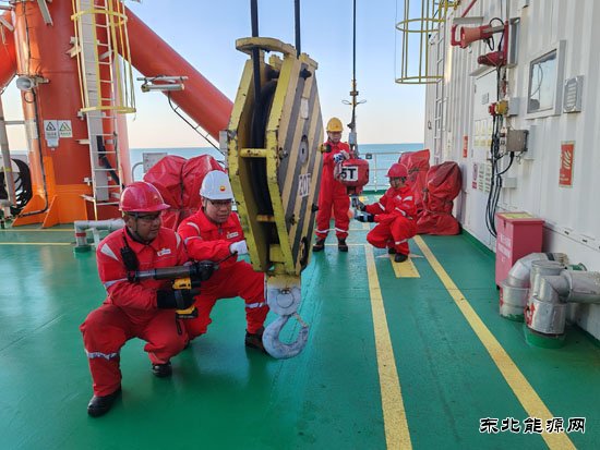 图为埕海1-1平台党员在进行吊车检验、维保作业。