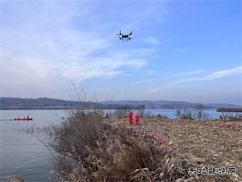 图为在技术人员的精准操控下,无人机悬吊气爆装置飞向水域深处预定点位,伴随着激发指令,无形纵波穿透水底,传回清晰可靠的地下勘探数据。