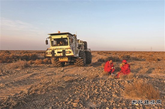 在寒风呼啸的戈壁上,汤奎连续5天和震源组跟班作业,观察设备作业状况,随时处理疑难问题。图为震源车在河道中进行生产试验。