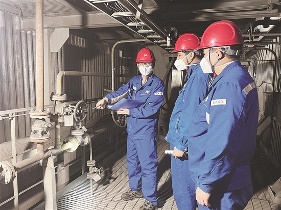 锅炉运行二班班长刘茂贵沿着工艺流程为青年员工介绍关键设备。 张慧 摄