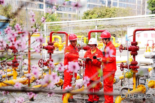 中国石油网消息 3月16日,初春的重庆春意盎然。西南油气田公司重庆气矿江北采输气作业区采气工崔剑与管理人员,手持平板通过数据分析生产状况,确保供气安全稳定。