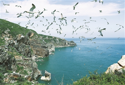 图为黑尾鸥在老铁山保护区上空飞翔。