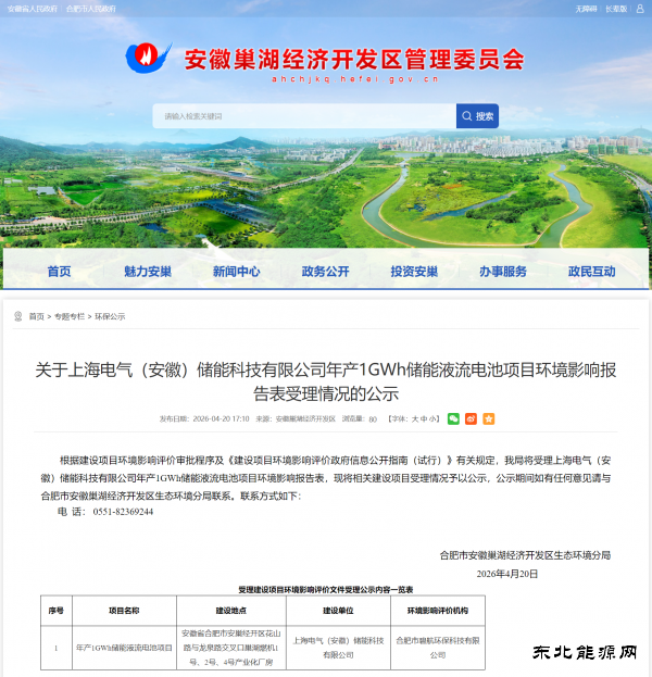 据全球液流电池网获悉,4月20日,安徽巢湖经济开发区管理委员会发布关于上海电气(安徽)储能科技有限公司年产1GWh储能液流电池项目环境影响报告表受理情况的公示。