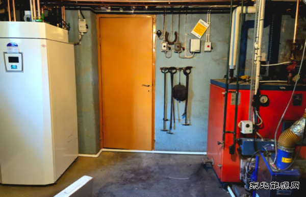 一个典型的混合住宅供暖和制冷系统,包括一个新的空气-水热泵(左)和一个现有的改造颗粒燃烧器,右侧是一个旧的油锅炉。
