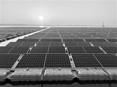 清晨,位于安徽省淮南市丁集矿采煤沉陷区5300亩的水面上,37.28万片蓝色光伏板整齐排列,在阳光照射下与波光粼粼的水面交相辉映,格外壮丽。