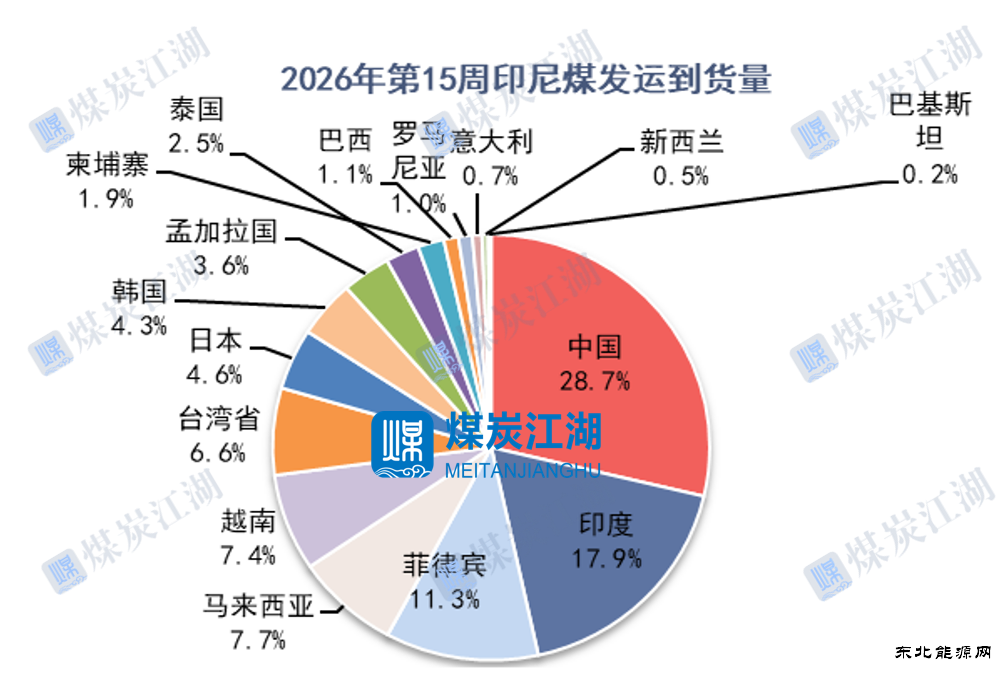 2026年第15周(4.6-4.12),世界各国进口印尼煤到货量为658万吨,合计108艘船。其中中国到货量189万吨、印度到货量117万吨、菲律宾到货量74万吨、马来西亚到货量51万吨。