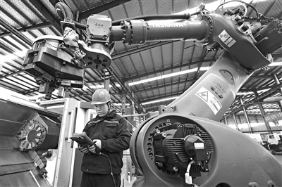 河南省焦作市温县经济开发区一家企业的职工在操作工业机器人加工订单产品。