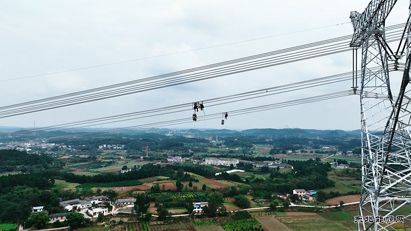 12月25日,在德阳市中江县,阿坝—成都东1000千伏特高压交流输电工程15标导线展放作业现场,国网四川电力工人正在安装间隔棒。国网四川建设公司供图