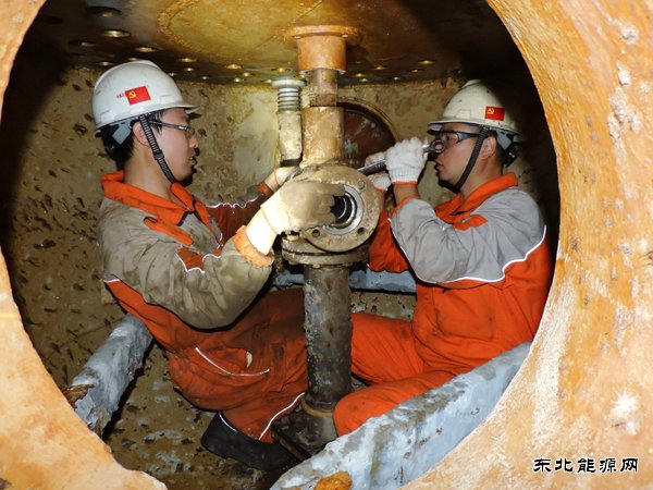 该油田党支部以党建引领提质增效,积极开展“党员在行动”活动,通过内部挖潜、整合资源完成自检自修项目90余项,节约外委维修费62万元。图为两名党员在进行海水滤器检修作业。(通讯员 欧阳建平 摄影报道)