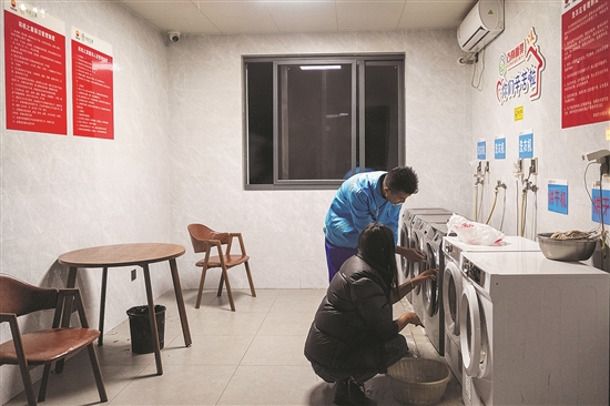 青年员工褚浩宇在“司机之家”指导长途货运司乘人员使用洗衣设备。韩超 摄