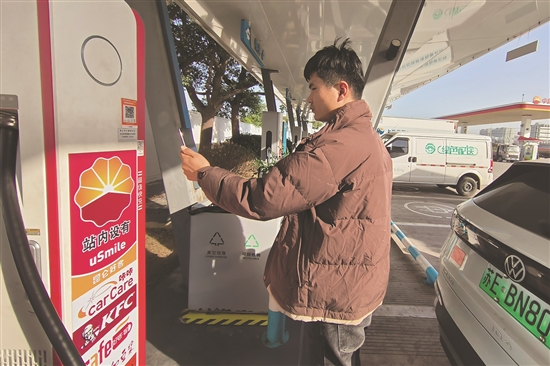 顾客在站内扫码为新能源车充电。魏剑毅 摄