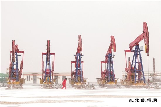 图为12月13日,金海采油厂采油作业三区员工顶着大雪开展巡检。