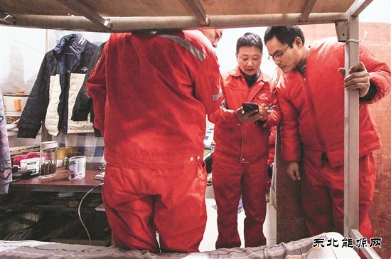 为保证生产顺利进行,汤奎(右)和修理工顶着严寒排查设备故障。
