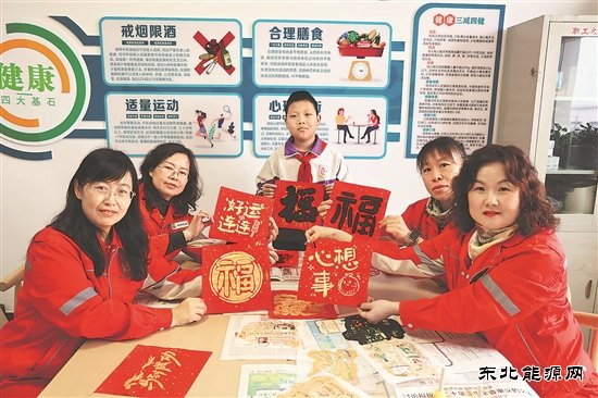 图为员工和家属拓印“福”字。杜慧敏 摄