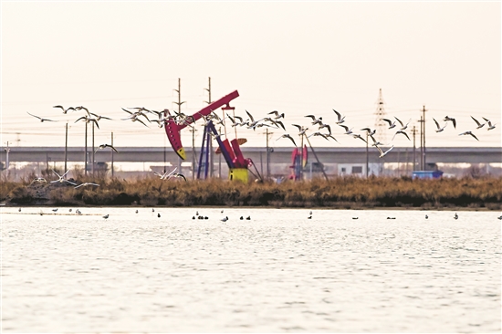 图为琵鹭在抽油机旁飞舞觅食。郭海涛 摄