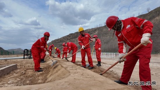 图为虎狼峁作业区柳一转中心站党员在柳151-5井场修筑防洪埂,加固设备设施基础。