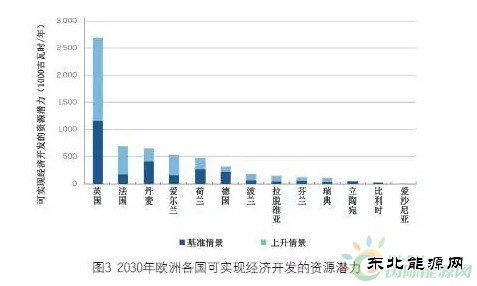 在基准情景下,装机主要来自于北海周边国家,包括英国、丹麦、荷兰、德国和法国等。而在上升情景下,爱尔兰、波兰、拉脱维亚以及立陶宛也会有新增装机。